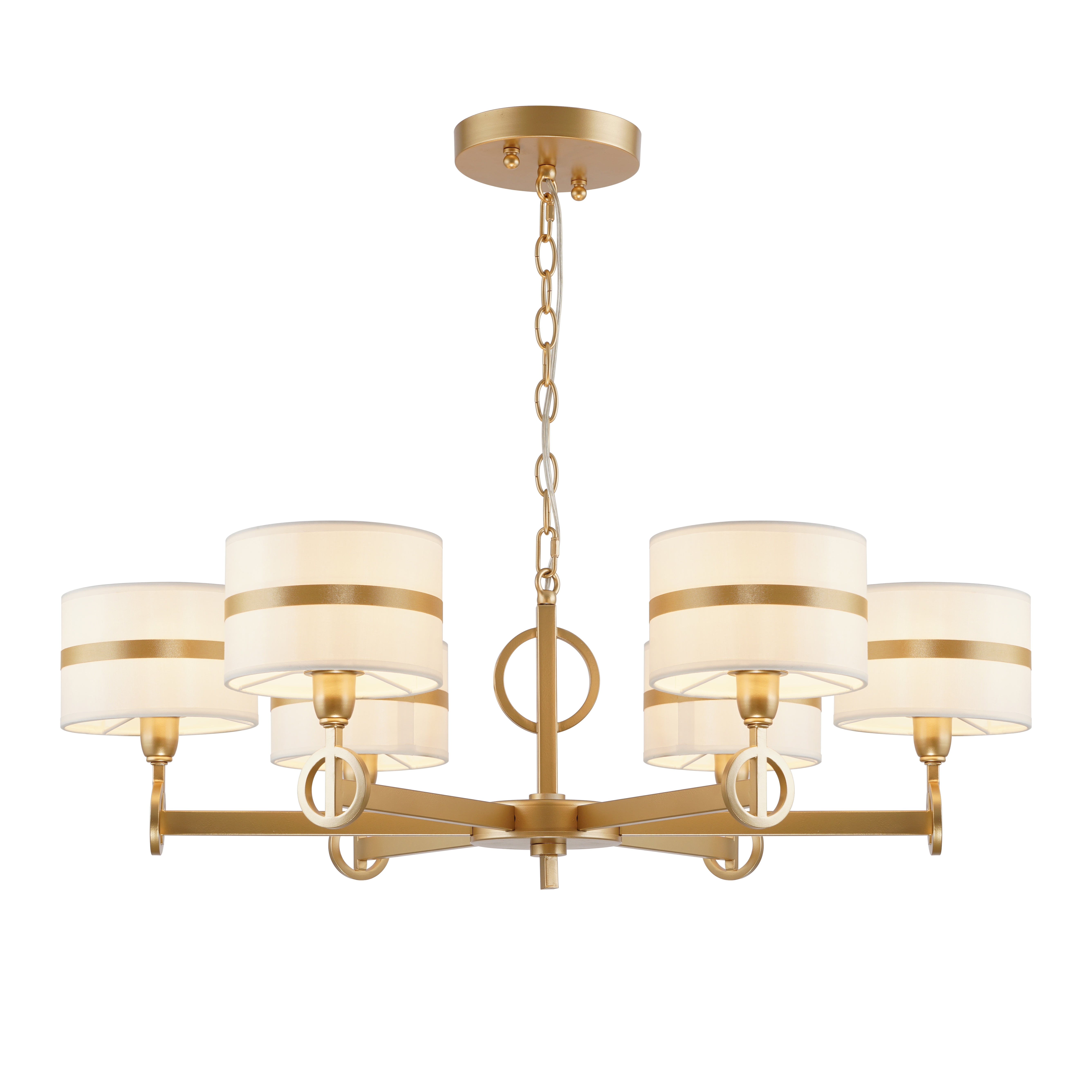 Оригинальность коллекции Mateo состоит в том, что каркас любой люстры можно перевернуть и закрепить плафонами вниз или вверх, придавая люстре и помещению желанный вам образ. Но главной изюминкой является дизайнерская идея — металлические кольца на рожках и центральном штоке находят отклик в золотых лентах декора абажуров. Это одна из самых популярных и любимых дизайнерами коллекций, в которой представлены два варианта настенных светильников и люстр, а также подвес, настольная лампа и торшер.