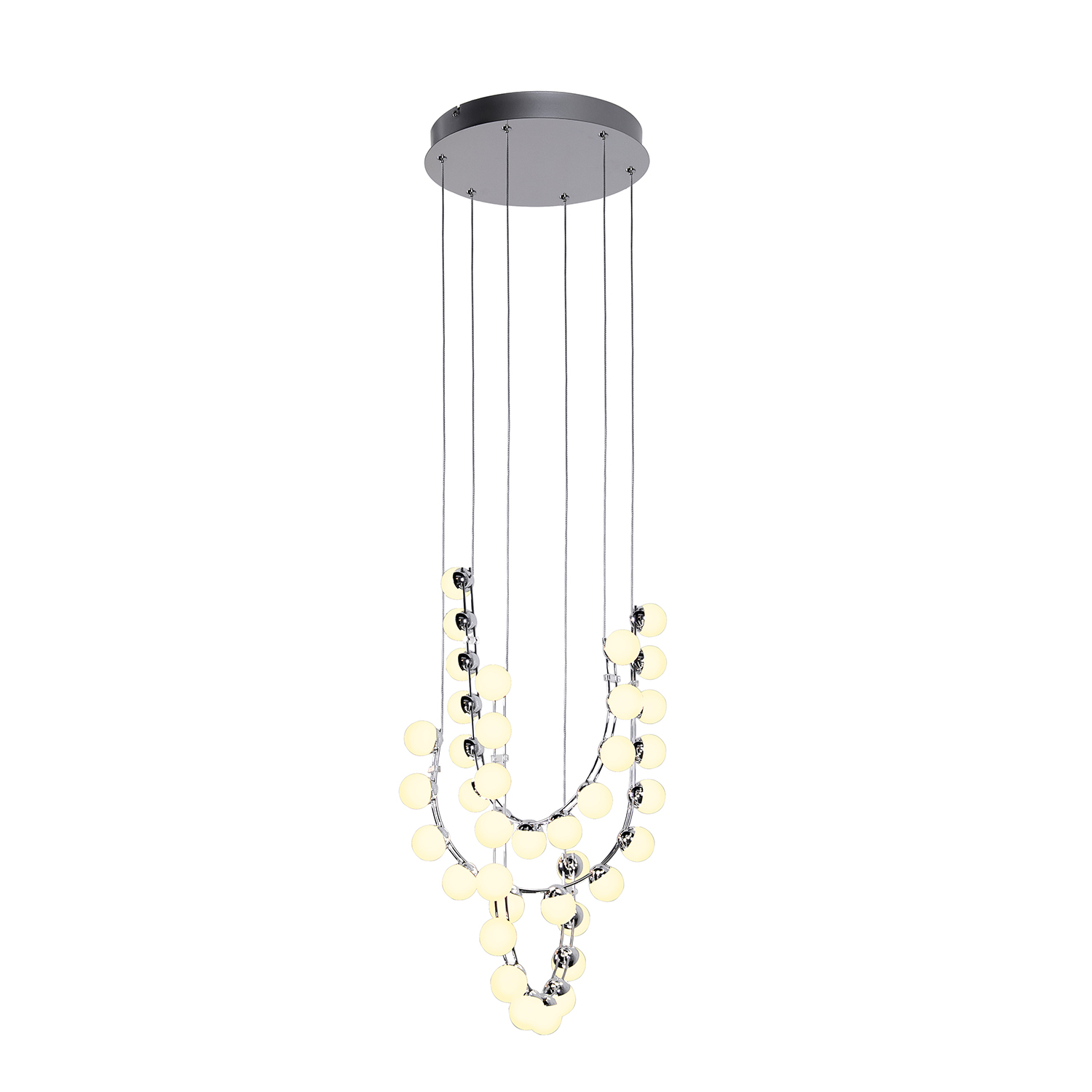 Helmet — уникальные светильники кольцевой конструкции. Низковольтный каркас, служащий проводником электричества, играет роль не только функциональной основы, но и эстетического акцента. Каждое кольцо словно ожерелье украшено белыми акриловыми шариками в качестве плафонов, придавая светильнику изысканный вид.