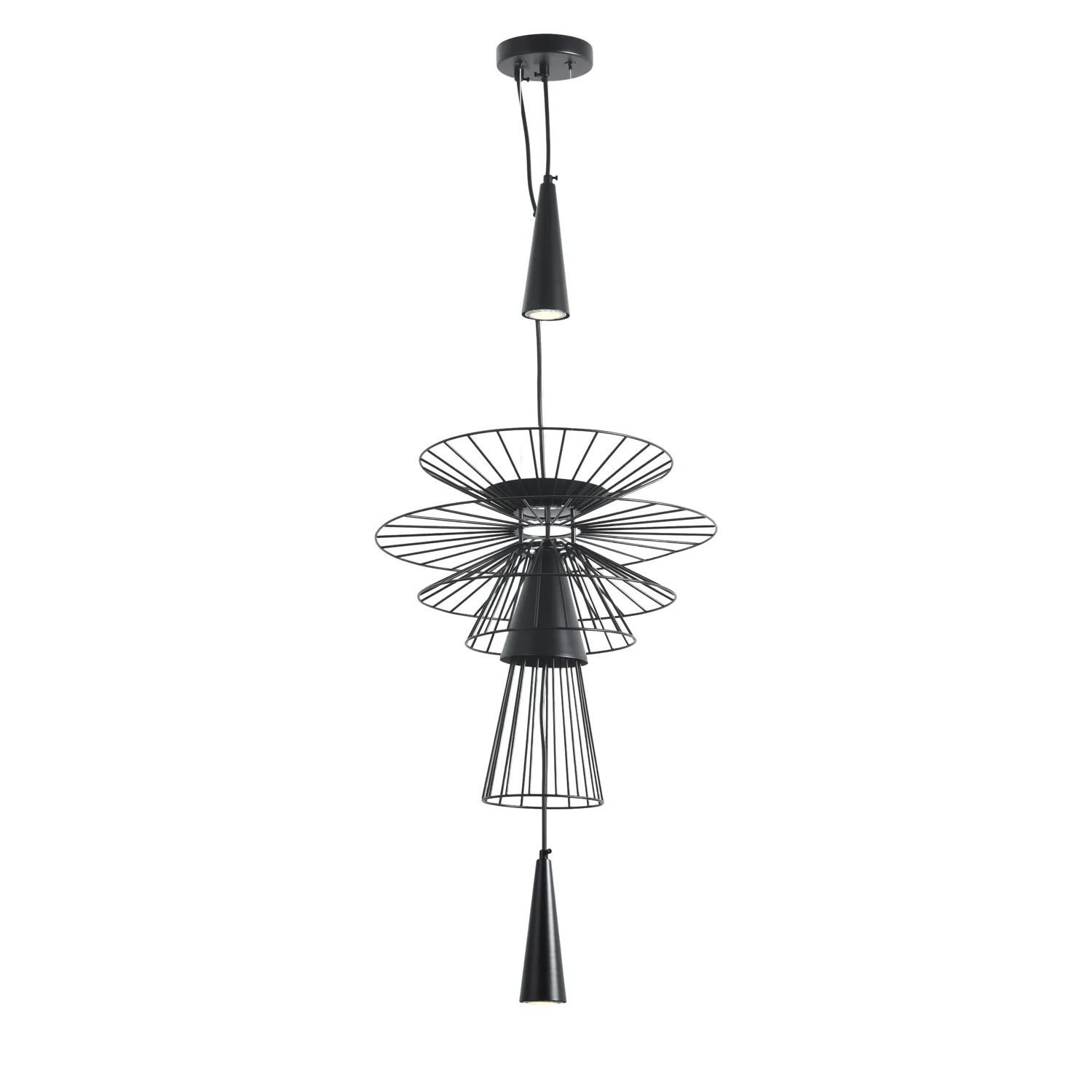 Коллекция светильников Ardor воплощает графичную геометрию и архитектурную лёгкость в выразственной дизайнерской форме. Многоуровневая конструкция из тонких металлических прутьев формирует динамичный силуэт, создавая эффект объёма и воздушности. Конусообразные плафоны направляют свет вниз, формируя акцентное освещение и подчёркивая структуру пространства. Открытая форма светильников создаёт выразительную игру света и тени, добавляя интерьеру глубину и визуальный ритм. Коллекция представлена в актуальных оттенках — чёрном и золотом, что позволяет органично интегрировать её в современные, индустриальные и минималистичные интерьеры. Ardor станет эффектным акцентом в гостиной, столовой или пространстве с высокими потолками, подчёркивая индивидуальность и характер интерьера.