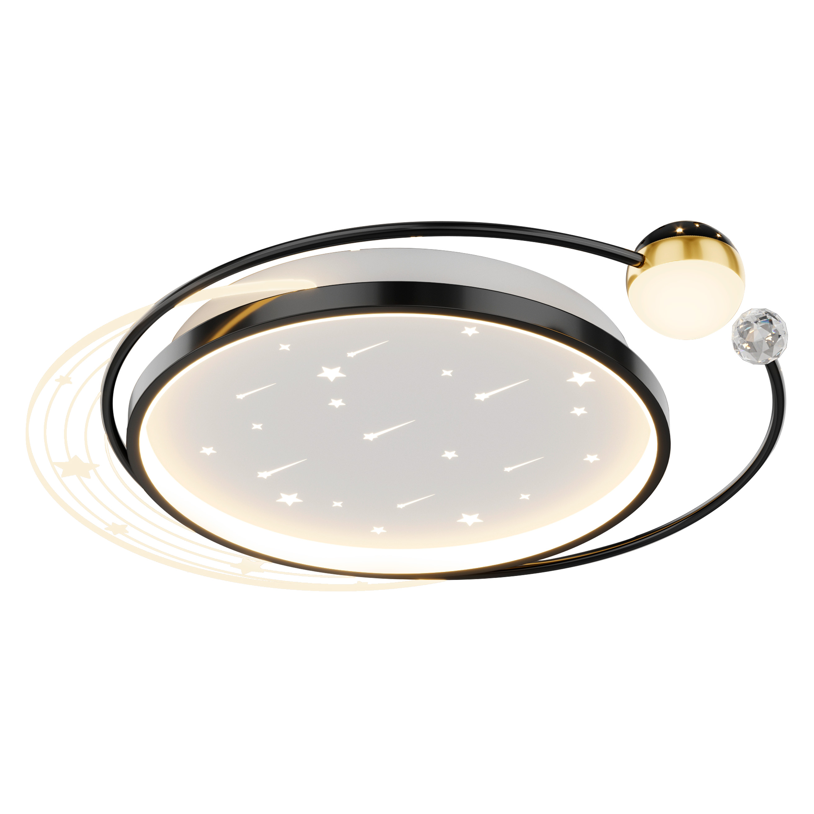 Коллекция потолочных светильников Cruise станет не только стильным элементом интерьера, но и наполнит вашу комнату волшебством. Главной особенностью светильников этой коллекции является дополнительный плафон, который создает эффект звездного неба на потолке, наполняя пространство атмосферой уюта и романтики. Каждый светильник украшен крупным кристаллом, который добавляет изысканности, а декоративный элемент из прозрачного акрила с гравировкой звезд придает уникальность и шарм. Ещё одним преимуществом этой коллекции является возможность регулировки температуры освещения от теплого желтого, до холодного белого цвета при помощи идущего в комплекте пульта. Основным источником света является белый акриловый плафон со звездами, обрамленный каркасом черного или золотого цвета. Такое сочетание делает светильники Crusie универсальны решением, которое идеально дополнит интерьер детской, спальни или гостиной.