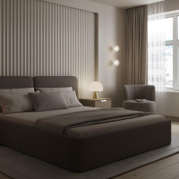 Спокойствие, уют и лаконичность — главные акценты этой спальни. Просторное, но при этом очень тёплое пространство оформлено в нейтральной гамме: бежевые стены, коричневое изголовье кровати и деревянные элементы создают атмосферу гармонии и внутреннего покоя.