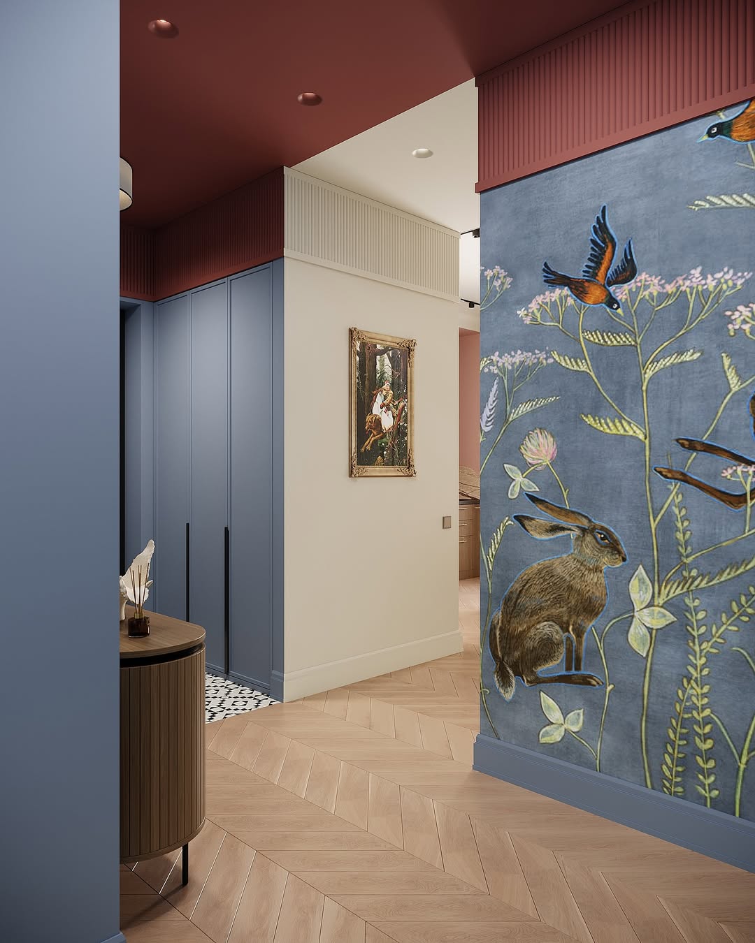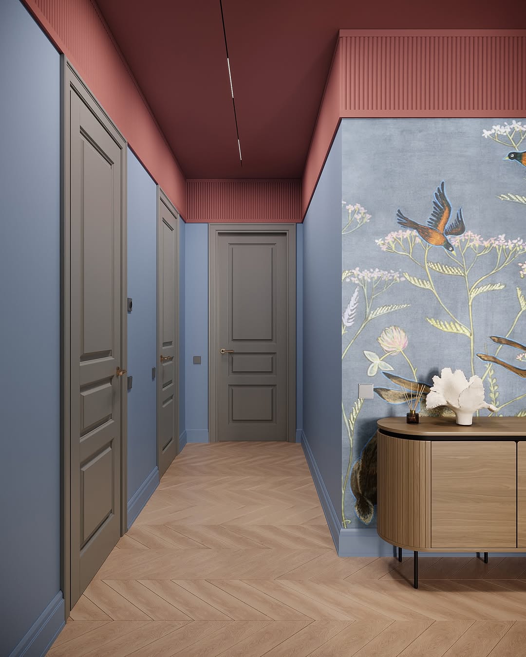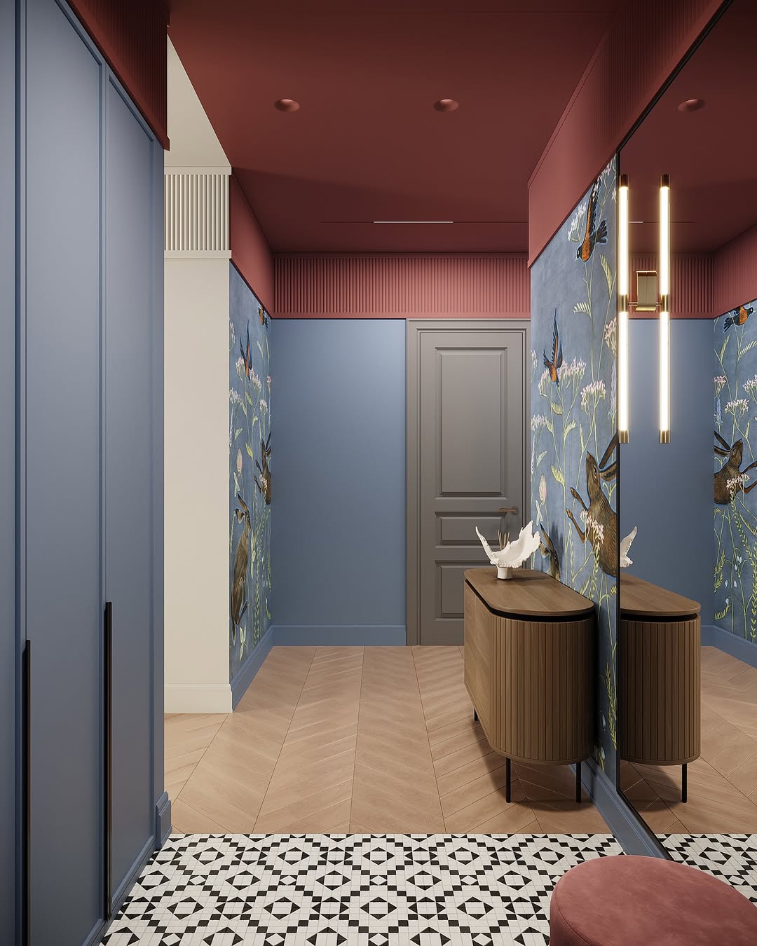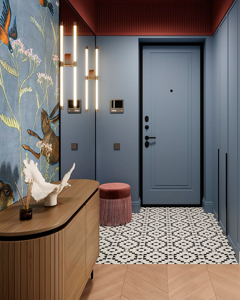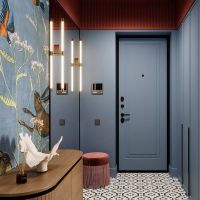 Светильники Favourite стали частью проекта, который вдохновлен живописью Михаила Врубеля: глубокий синий цвет стен напоминает «Царевну-Лебедь», бордовый потолок добавляет драматургии, а серые двери и паркет “ёлочка” создают спокойный фон для игры цвета и света.